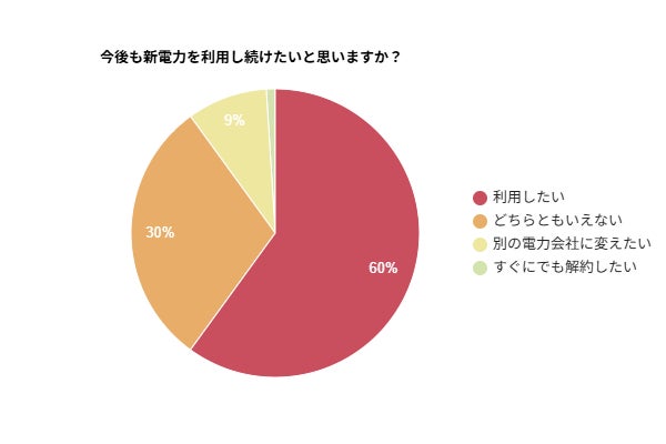 さらに、今後も新電力を継続して利用したいと回答した人は約60%にのぼり、全体を通して特にコストパフォーマンスの面で多くの利用者に支持されている実態がうかがえます。