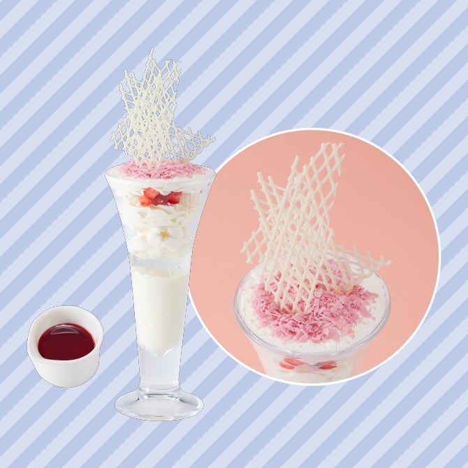 マシュマロ、バニラアイス、バナナなど白い食材で、プランスの好きな純白に仕上げたパフェに、ヒロイン 竜崎 桜乃をイメージさせるピンクや赤を、フィアンティーヌやフローズンストロベリーで表現することで、桜乃に恋するプランスをイメージしました。パフェの上部に重ねて飾った格子状のチョコレートは、プランスがリョーマに試合中何度もラケットのガットを破られるシーンを表現しています。別添えのほんのり甘酸っぱいストロベリーソースを、お好みでかけてお召し上がりください。