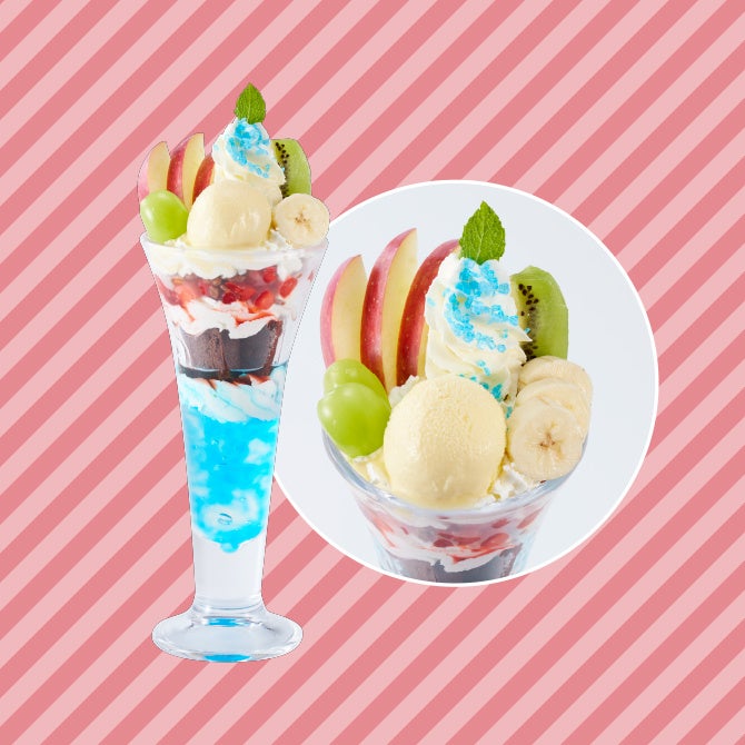 ブルーシロップの色合いが目を引く、フレッシュフルーツを贅沢に使用したパフェです。不二の必殺技の色をイメージしたキウイやシャインマスカット、好物のリンゴを使用しました。天然水ゼリー、ブルーシロップ、ホイップにかけたブルーの砂糖の結晶で跡部の氷を表現しています。また、試合中の跡部、不二の内に秘めた闘志を、赤いフローズンストロベリーで表現しています。なかなか見られない不二と跡部の競宴を、コラボパフェでお楽しみください。