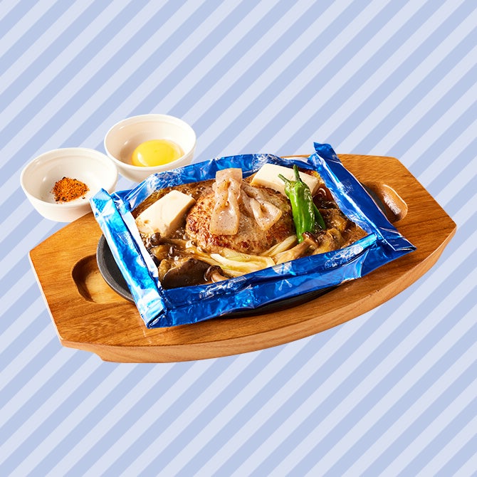 主人公、越前 リョーマの好物「和食」をイメージし、ココス自慢の包み焼きハンバーグを“和風”にアレンジしました。オリジナルデザインのアルミホイルを開けると、リョーマの得意技ツイストサーブをイメージした“ツイストこんにゃく”をはじめ、豆腐やきのこ、ししとうなどが入ったボリューム満点の一品です。光る打球をイメージした別添えの卵黄で味にまろやかさが加わり、七味が全体の旨みを引き立てます。ぜひ最後まで味の変化をお楽しみください。テイクアウトでもご注文いただけます。