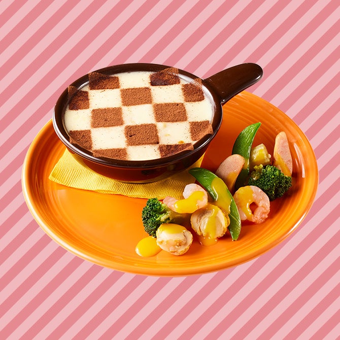 ミルキー&マックの試合中に出てくるチェス盤を、ドリアソースの表面にココアパウダーで格子を描くことで表現しています。ドリアの中にはコーン(イエロー)や明太子ソース(ピンク)、付け合わせの食材にはチーズソース(イエロー)やエビ(ピンク)を使用するなど、ミルキー&マックが好きな色の食材を取り入れました。付け合わせの食材をチェス盤の上に並べて、作中でのシーンを表現しながら楽しめる商品になっています。
