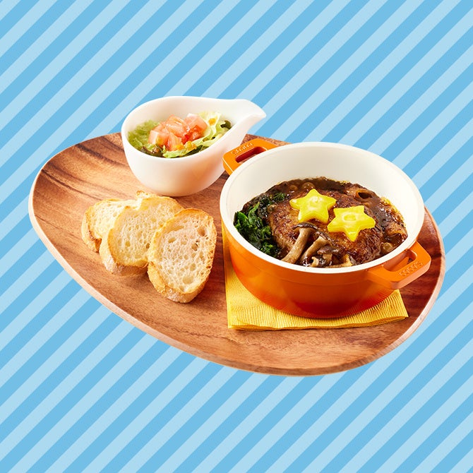 種ヶ島が作中で、ペットボトルのキャップを握ってゼウスに勝つシーンを、ココス新定番のココットハンバーグで表現しました。ハンバーグは種ヶ島の拳を、ハンバーグの下に隠れているペンネやチーズはペットボトルのキャップをイメージしています。ほうれん草やしめじは、味わい深いデミグラスソースとよく合います。また、語尾につく「☆」を星形のパプリカで表現し、種ヶ島らしい商品に仕上げました。
