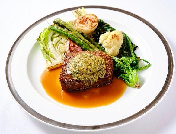 とろける「カフェ・ド・パリソース」をたっぷりとつけて楽しむフレンチスタイルのステーキの満足感は、未体験のものとなるでしょう。付け合わせの焼き野菜も、朝採れの新鮮なものを選び、和牛の牛脂で焼くことにより一皿に一体感が生まれます。ボリューム感いっぱいなのに、“もっと食べたい”と感じるステーキです。