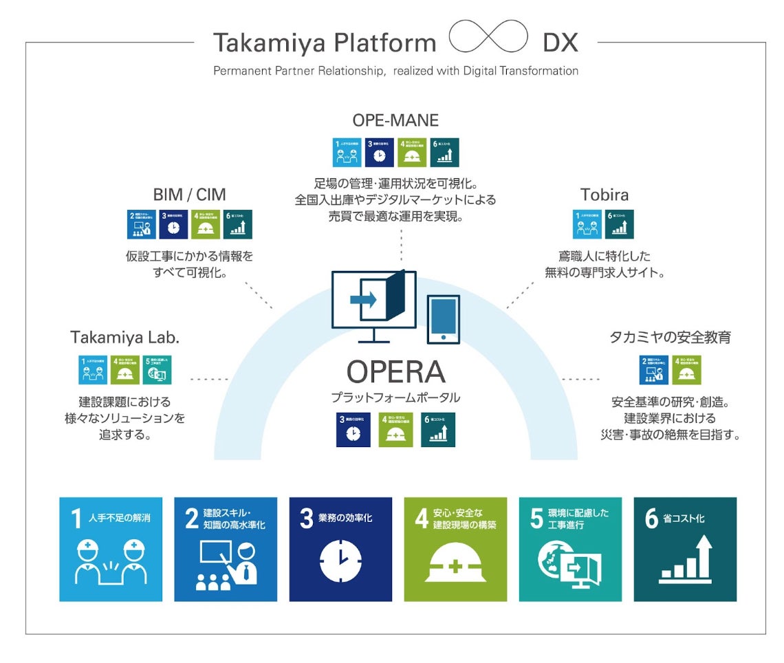 また、建設業の深刻な人手不足・コスト高などの問題に対応するため、建設ソリューション群「タカミヤプラットフォーム」を提供しています。足場等の仮設機材の調達・運用マーケットプレイス提供やデジタル設計支援等のデジタル化にはじまり、各種安全教育サービスまで、多岐にわたるソリューションを統合しています。