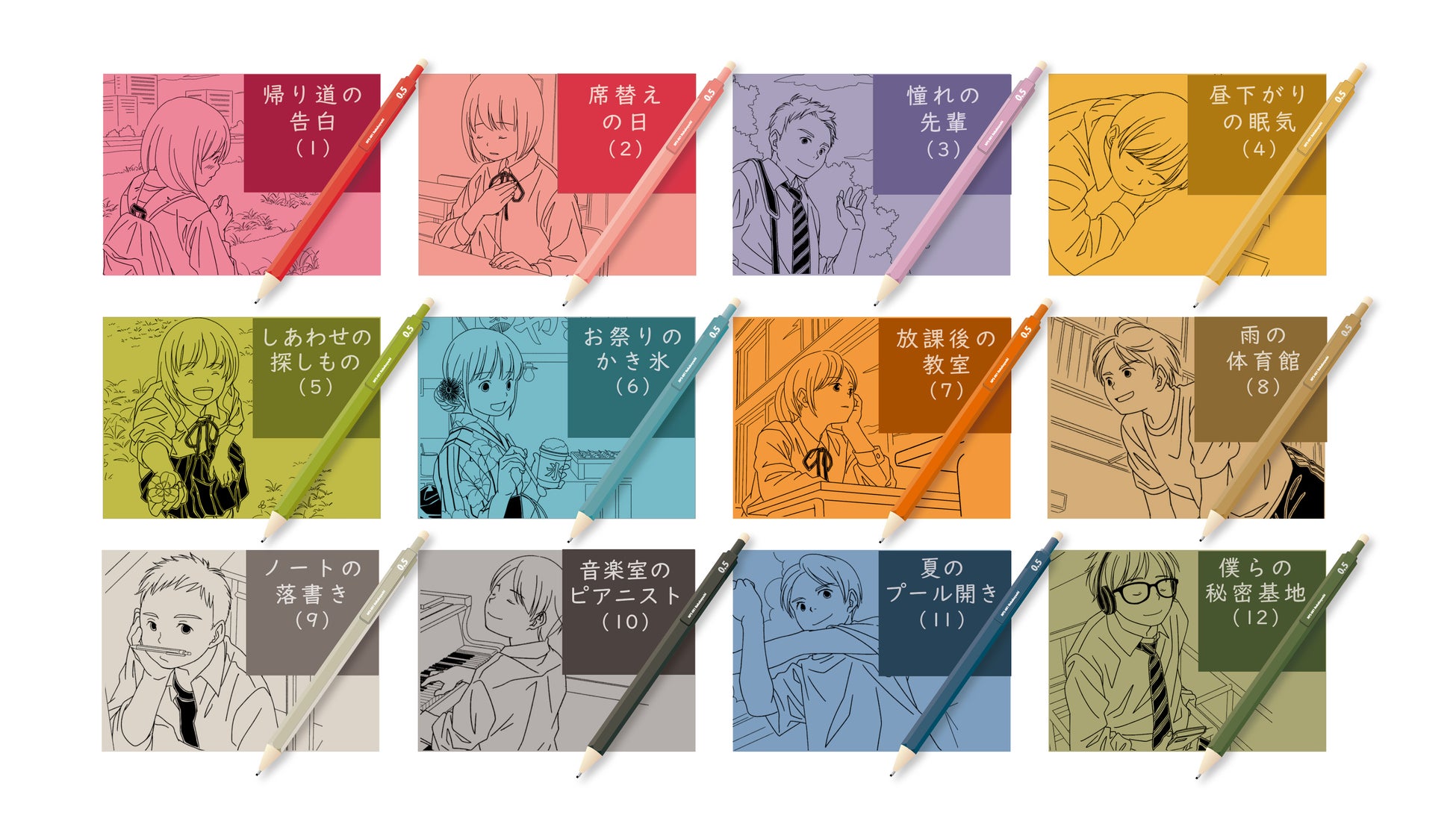 ラインアップ | 帰り道の告白(1)、席替えの日(2)、憧れの先輩(3)、昼下がりの眠気(4)、 しあわせの探しもの(5)、お祭りのかき氷(6)、放課後の教室(7)、 雨の体育館(8)、ノートの落書き(9)、音楽室のピアニスト(10)、 夏のプール開き(11)、僕らの秘密基地(12) |