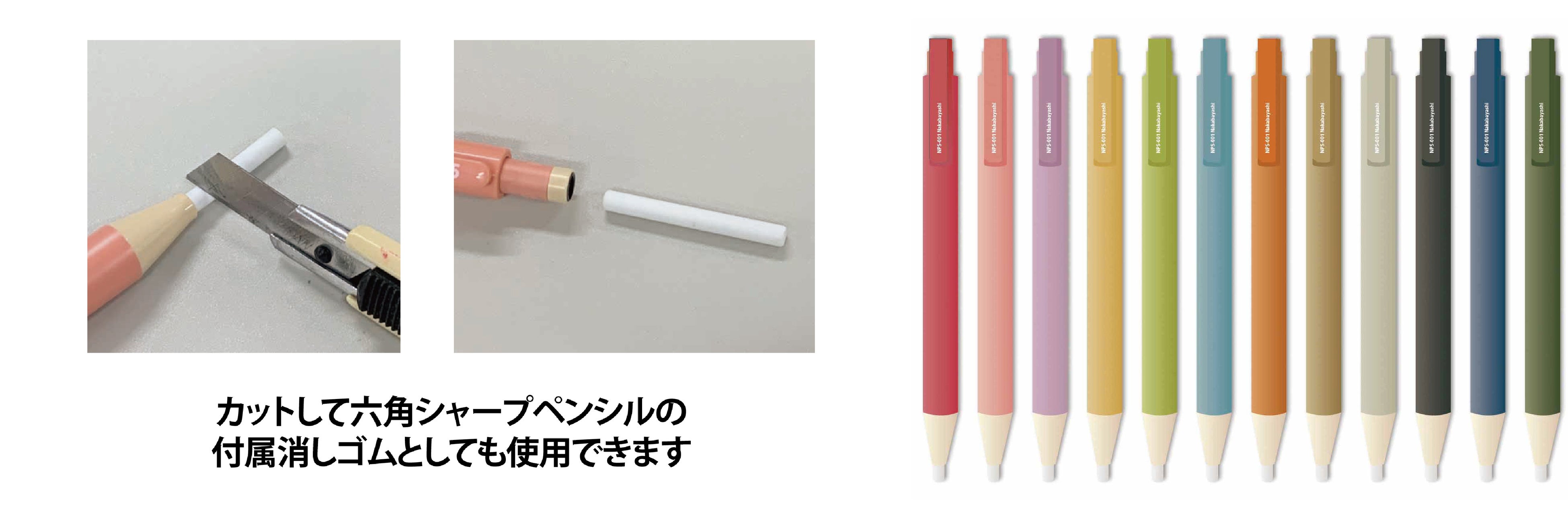 材質 | 本体:ABS、芯:炭素材料・34mm(0.5/0.9:B)(0.3:HB) 消しゴム:塩ビ34mm×径4mm |