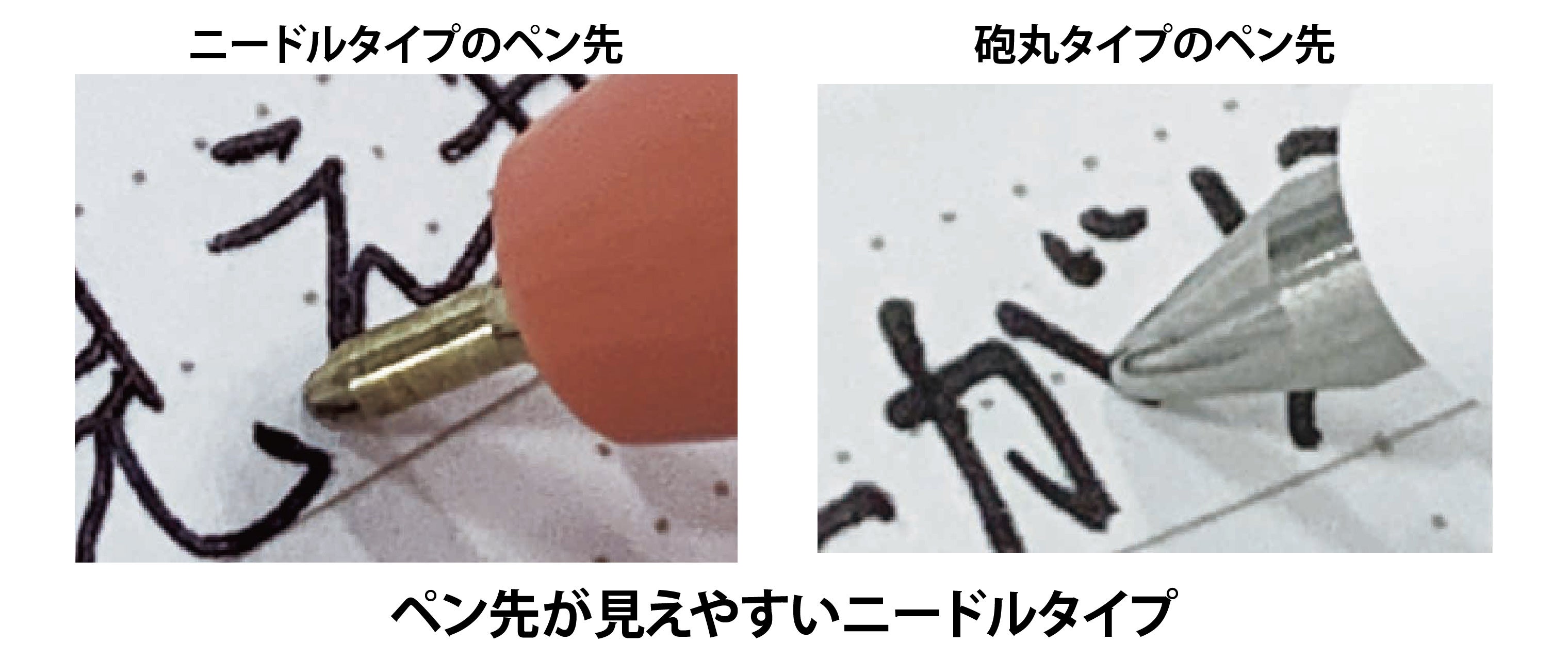 ・ニードルタイプでペン先が見えやすくなめらかな描き心地の低粘度油性ボールペン