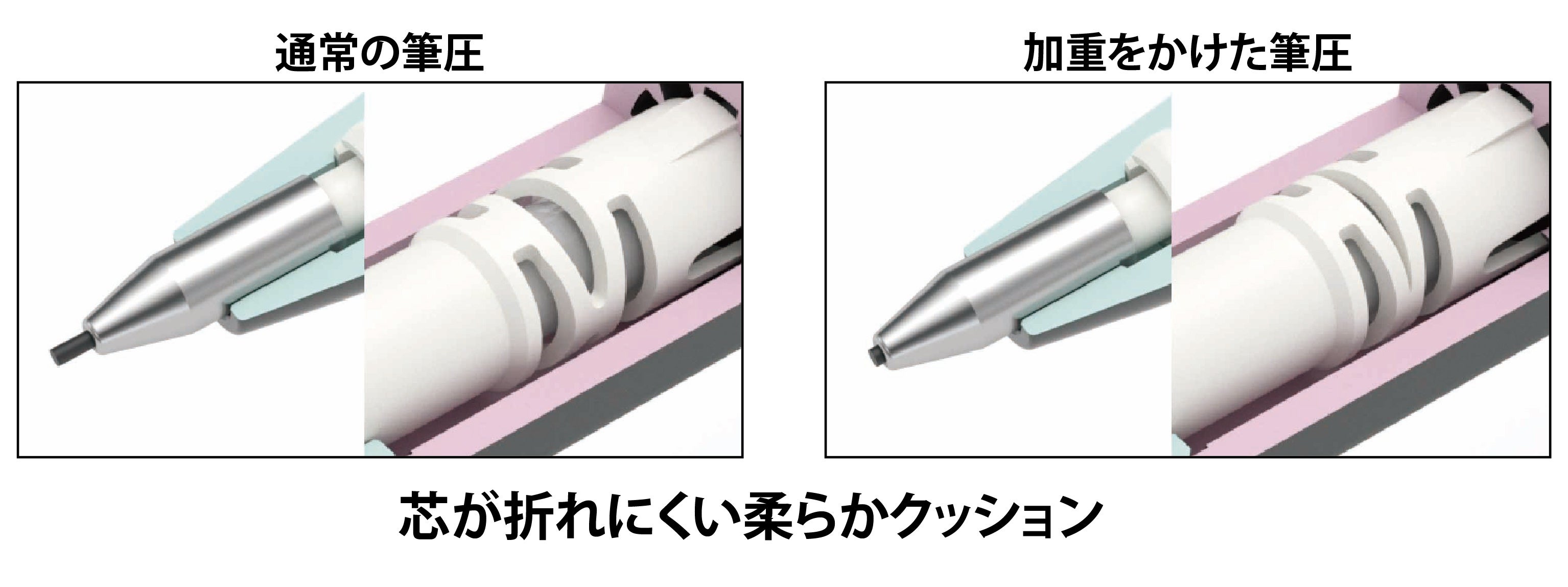 文字を描く時に力を入れすぎても芯が柔らかに凹んで折れにくい安心機構を採用。他にも繰り出し消しゴムや転がり防止のクリップといった便利機能を搭載しています。