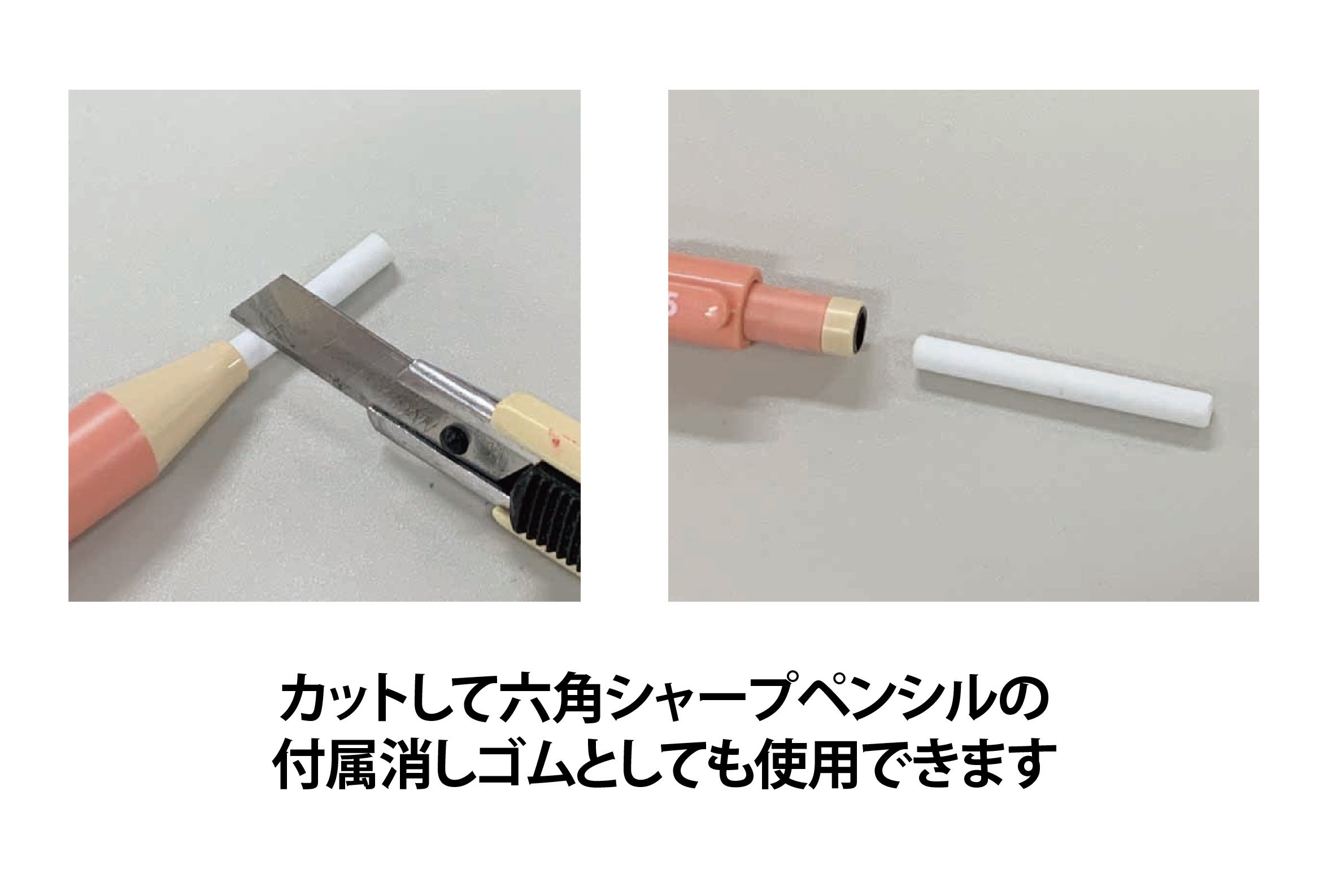細かい部分をピンポイントで消すことが出来る円柱型消しゴムです。六角シャープペンシルの繰り出し消しゴムと太さが同じなので、カットして差し込むこともできます。