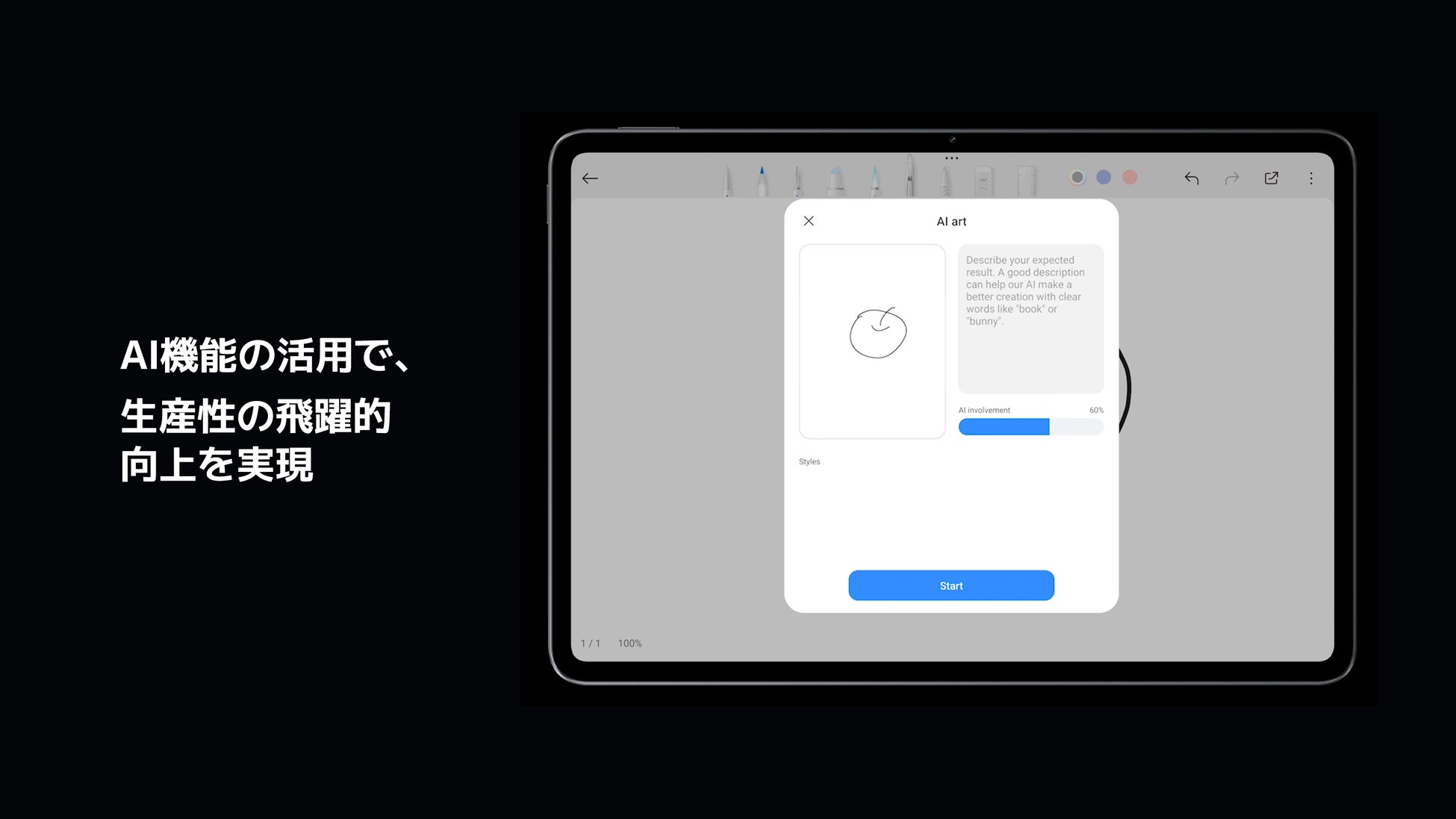 アクセサリーのみならず、「AIアート※」機能を使用すれば、簡単な落書きだけでも、様々なスタイルの絵画をスマートに生成し、使用者の創造性を一瞬に美しく表現することができます。
