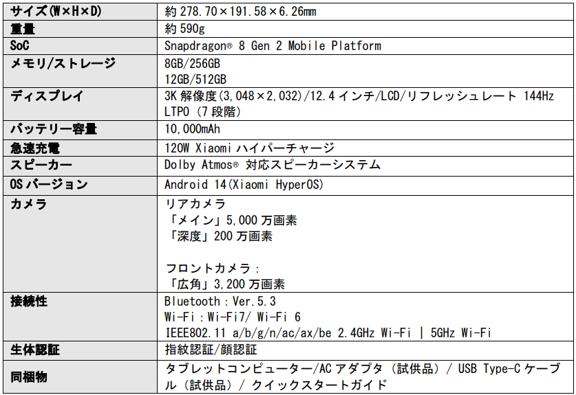 Xiaomi公式サイト(mi.com):https://www.mi.com/jp/product/xiaomi-pad-6s-pro-124