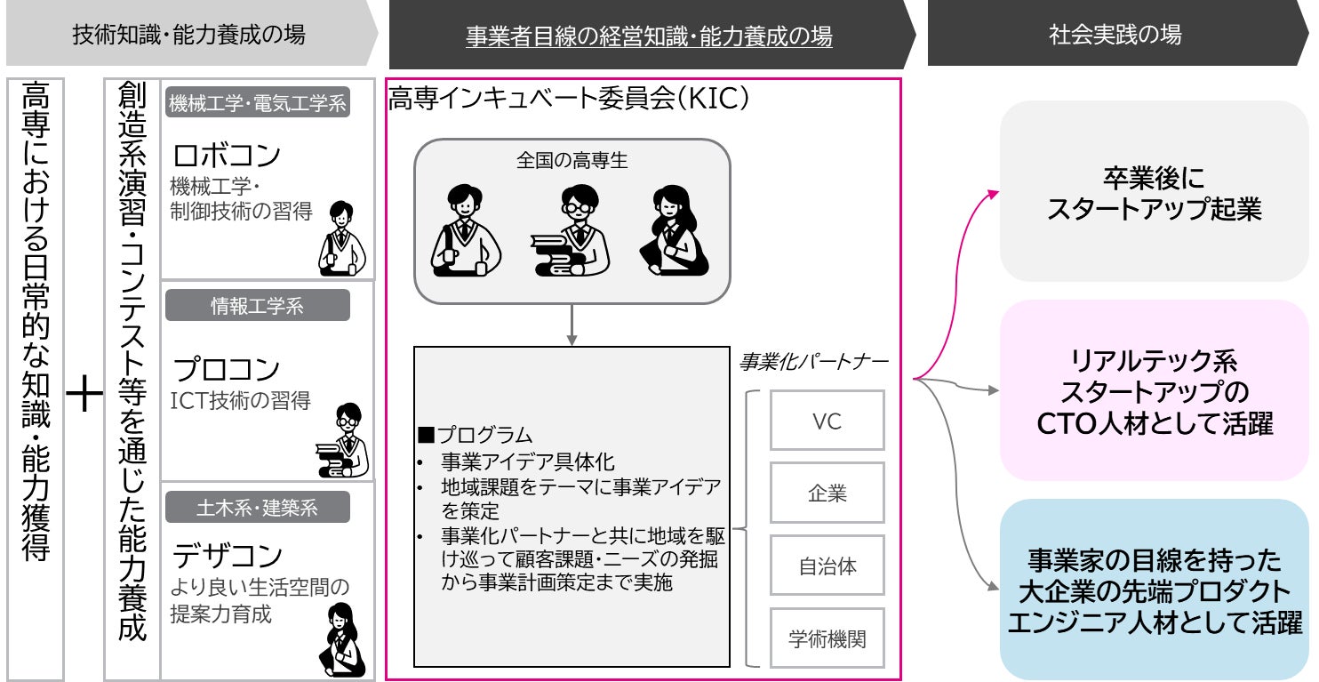 「KIC事業」は、全国の高等専門学校向けに、高専教育で培った専門分野の知識や技術を活かし、地域や身の回りの課題解決につながる事業の構想、及びこの活動を通じて起業家やスタートアップ、経営人財として重要であるアントレプレナーシップを養うことを目的としたプロジェクトです。