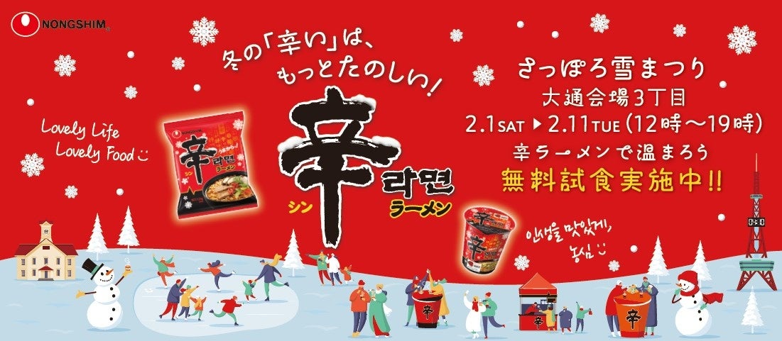 株式会社農心ジャパン(本社:東京都千代田区、代表取締役社長:金大廈)は、「さっぽろ雪まつり(2025年2月4日[火]~2月11日[火・祝])」(北海道札幌市)にて同時開催されるスケートリンク「スマイルリンクさっぽろ Supported by 辛ラーメン(2月1日[土]~2月11日[火・祝])」に初協賛します。過去最大級の無料試食会や、農心商品・雪まつりオリジナル辛ラーメングッズ販売等を通じて、“寒い時に食べるとさらにおいしく感じられる”辛ラーメンの魅力を、期間中の計11日間にわたってお届けします。また、2月1日(土)~2月28日(金)には、雪まつり会場周辺にも店舗を構える、北海道スープカレー「Suage」と辛ラーメンがコラボ。北海道・東京の計9店舗で期間限定オリジナル辛ラーメンを販売致します。