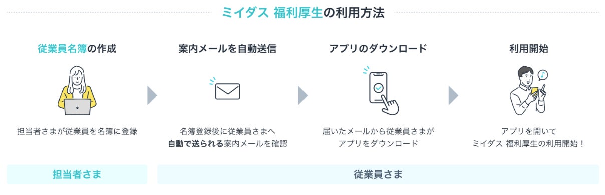 使い方は簡単!担当者は従業員名簿を作成するのみ。従業員は自動送信された案内メールからアプリをダウンロードすることで、簡単に利用することができます。