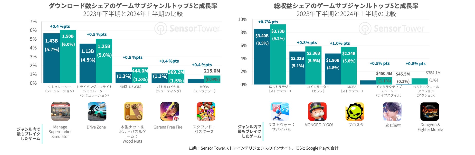 ダウンロード数を見ると、シミュレーターがダウンロード数シェアに基づくサブジャンルのトップ5で首位に立っています。一方、収益シェアはそれぞれ『ラストウォー:サバイバル』『MONOPOLY GO!』『ブロスタ』に牽引された、4Xストラテジー、コインルーター、MOBAが上位を獲得しました。