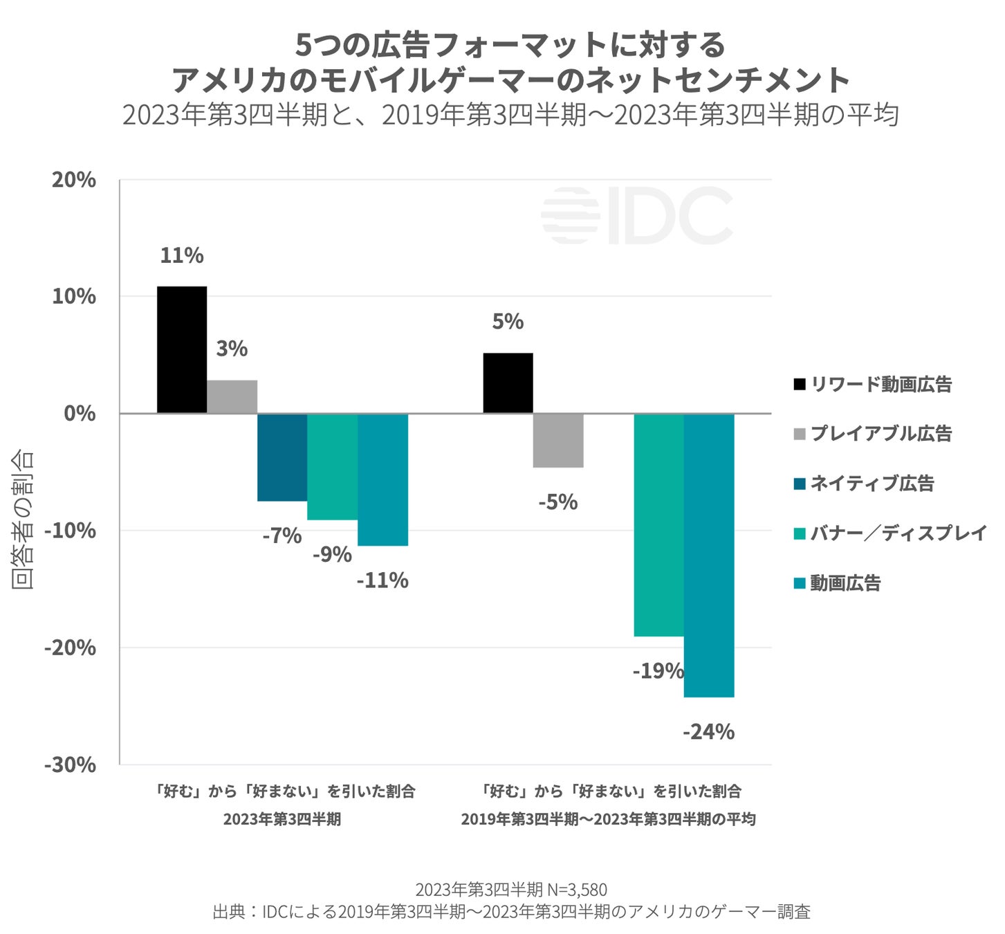 IDCによると、アメリカのモバイルゲーマーはリワード動画(RV)広告を好み、11%の肯定的な感情を示しているのに対し、動画広告は最も不人気で、感情の値は-11%でした。プレイアブルは5%、ネイティブ広告は3%で、やや肯定的な感情となりましたが、バナー/ディスプレイ広告については-7%の感情となりました。長期的(2019年第3四半期~2023年第3四半期)には、動画は-24%、バナー/ディスプレイ広告は-19%と、特に低いネットセンチメントスコアを示しています。これは、ゲーマーがRV広告を一貫して好んでいること、また動画およびバナー/ディスプレイ広告全般に対して嫌悪感を抱いていることを示しています。