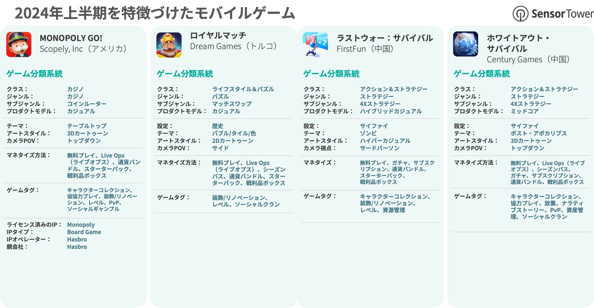 2024年上半期に好調であったモバイルゲームは、よく知られているボードゲームのモバイル版、パズルとライフスタイルのメカニクスを融合した仕掛けの豊富なマッチ3ゲーム、終末世界をテーマとした4Xストラテジーゲームなど多岐にわたります。これらのゲームの成功を促進する共通の要因は、強力なIPを利用し、市場の勢いに乗り、ライブオペレーションを活用していることです。