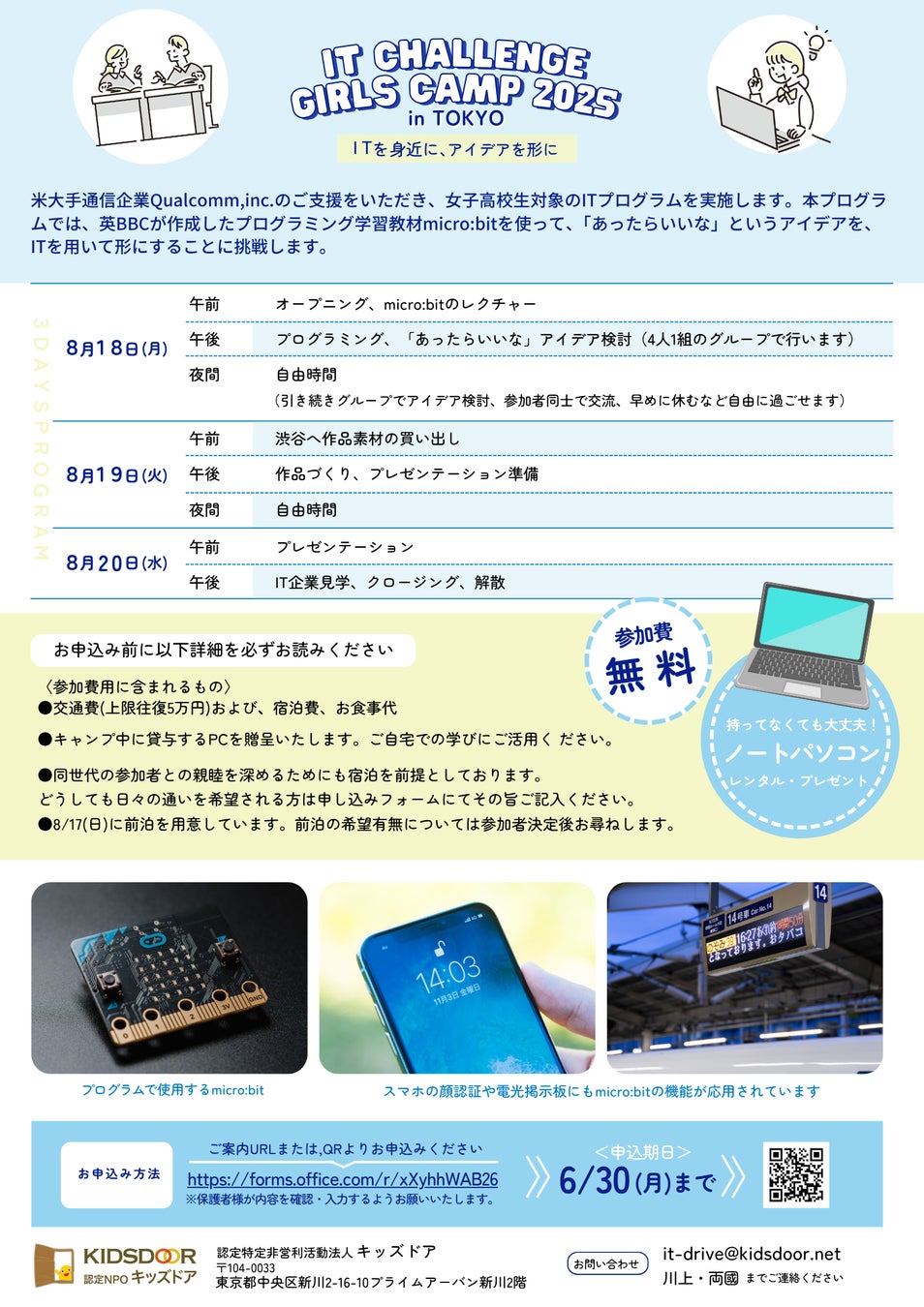 認定NPO法人キッズドアでは、米大手通信企業Qualcomm,inc.のご支援を頂き、女子高校生対象のITプログラムを実施します。本プログラムでは、英BBCが作成したプログラミング学習教材micro:bitを使って、「あったらいいな」というアイデアを、ITを使って形にすることに挑戦します。