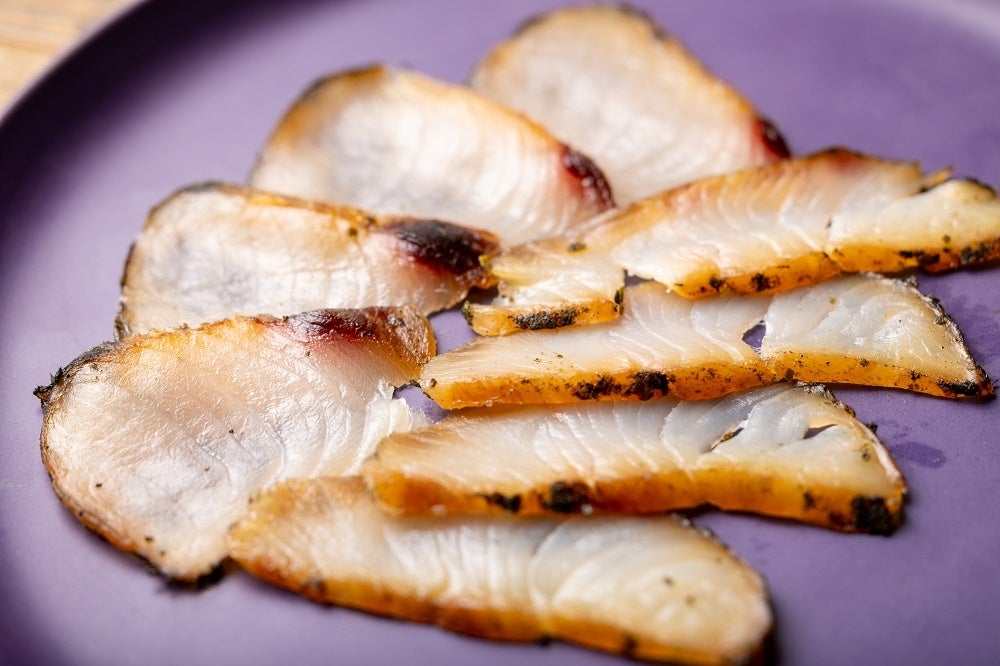 姪浜漁港から仕入れた旬の魚を姪浜海苔で塩漬けし熟成させ、魚の生ハムのように仕上げました。ビールやワインとの相性が抜群の1品です。