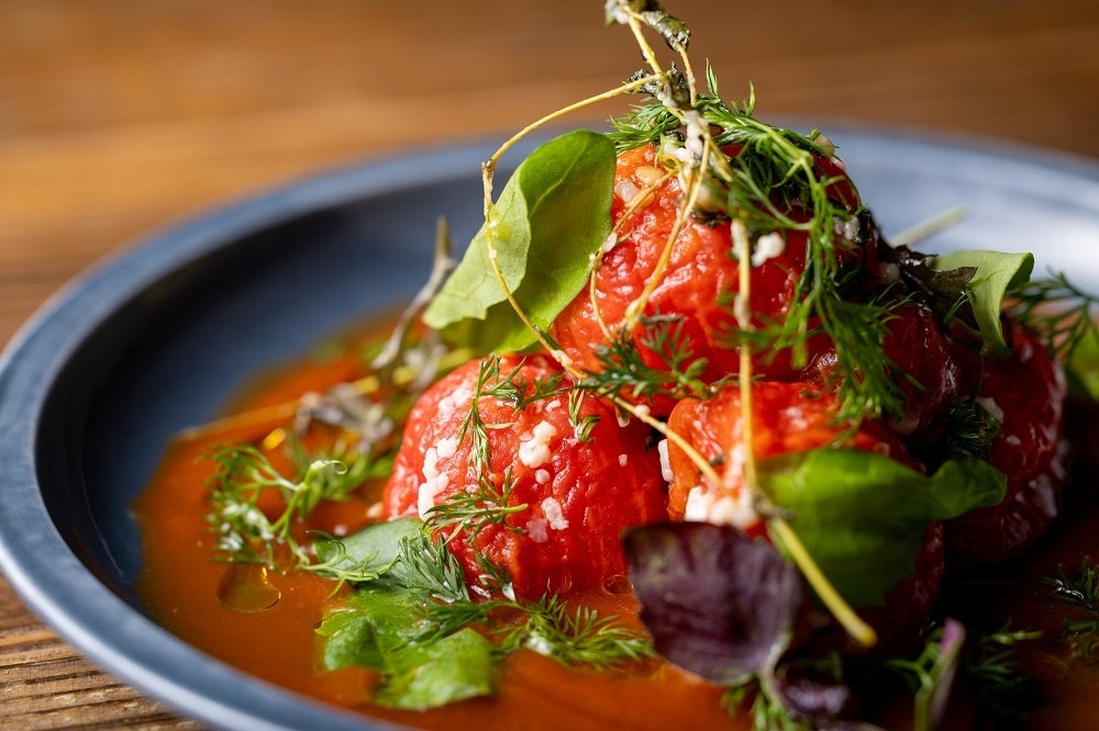 トマトを薪で半日燻し、コンブチャで作ったトマトソースを軽いスープ仕立てにしました。トマトの旨味が丸ごと味わえます。