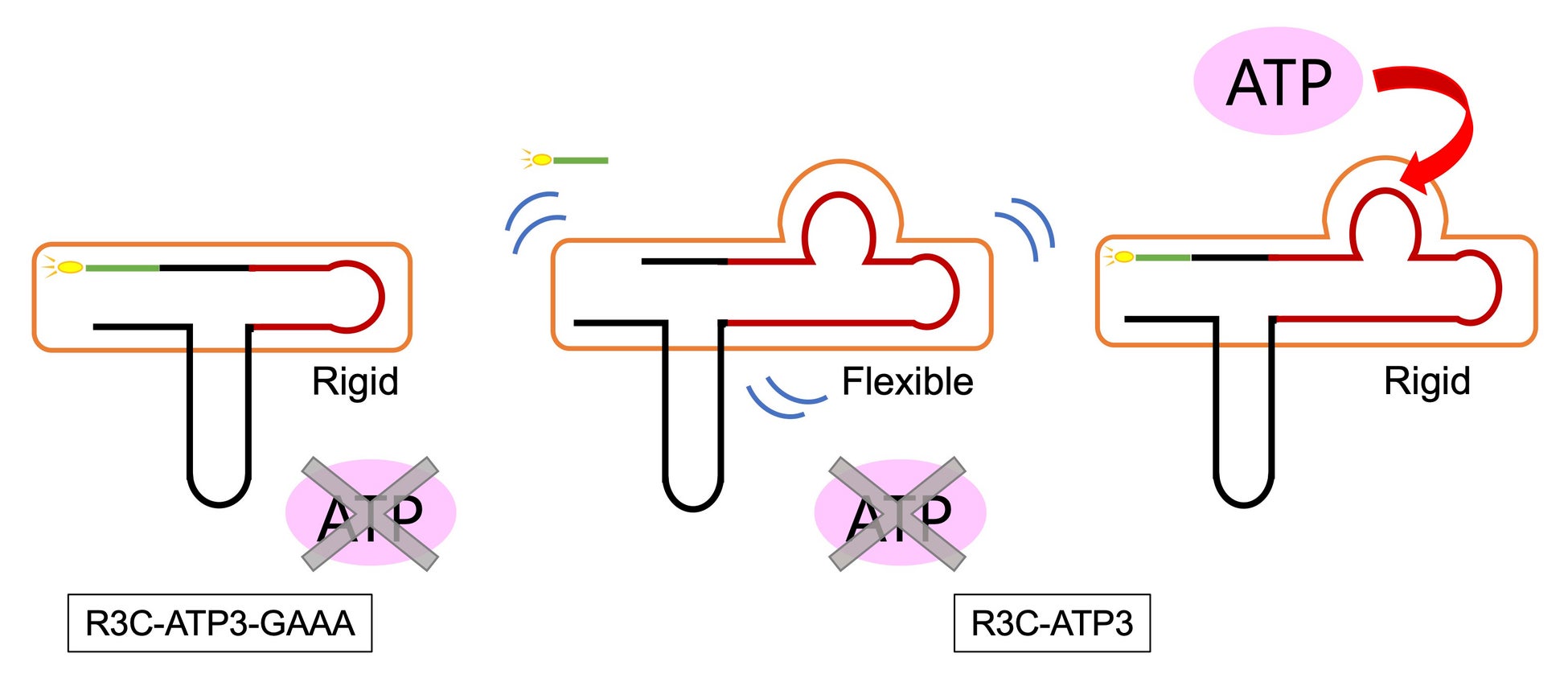 図3 R3C-ATP3-GAAAとR3C-ATP3の安定性の模式図。R3C-ATP3-GAAAの場合、連結部位周辺のステム構造は、ATPの有無に関係なく堅いと考えられる(Rigid)。対照的に、R3C-ATP3はATP非存在下では柔軟なコンフォメーションをとり(Flexible)、ATP存在下では安定になる(Rigid)。