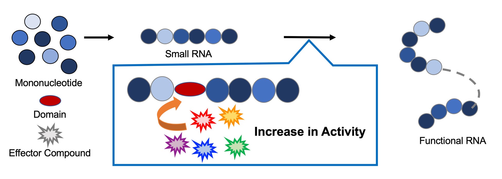 図1 リボザイムの進化過程の模式図。RNAが伸長する過程で、短いRNAは特定の化合物(エフェクター)と相互作用する他のRNAドメインと融合し、その結果、活性制御が特定のエフェクターに依存するRNAができたと考えられる。