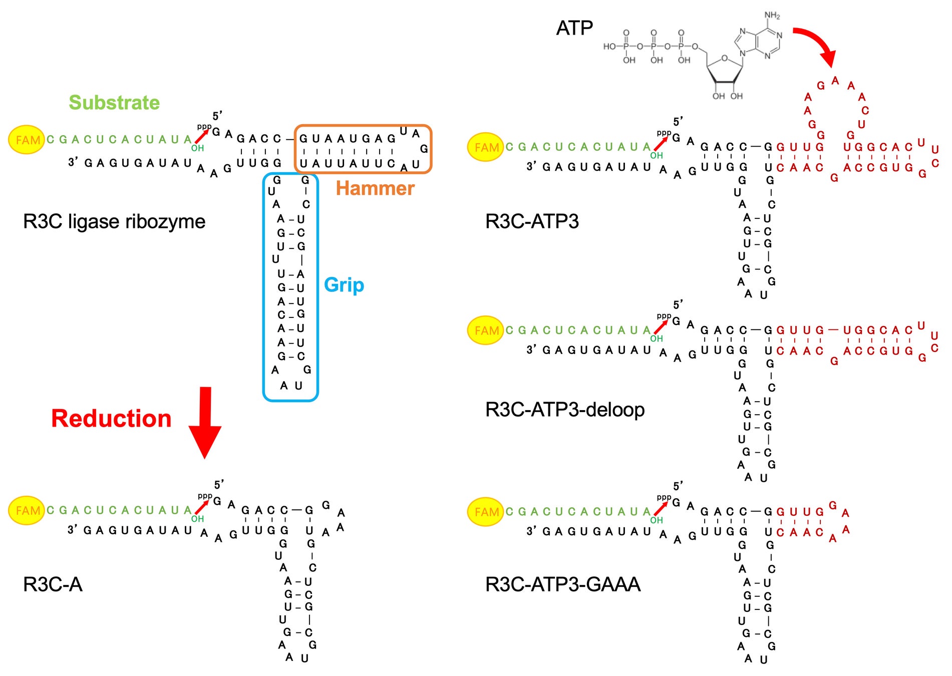 RNAワールド仮説を検証するため、既存のR3Cリガーゼリボザイム(73ヌクレオチド)の縮小化が行われ、46ヌクレオチドからなるR3C-Aが作製されました。作製されたR3C-Aの連結活性は元のR3Cリガーゼリボザイムと比べ、著しく低下しました。