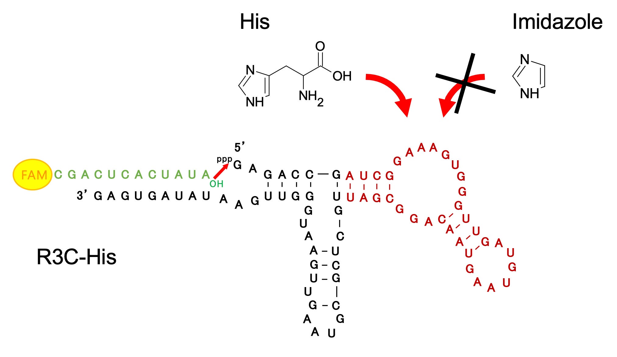 図4 R3C-AのHammer部分にHis結合アプタマーRNAを融合させたR3C-His。R3C-HisはHis依存的に連結活性を示したが、Hisの側鎖部分に相当するイミダゾールでは、活性の上昇が見られなかった。