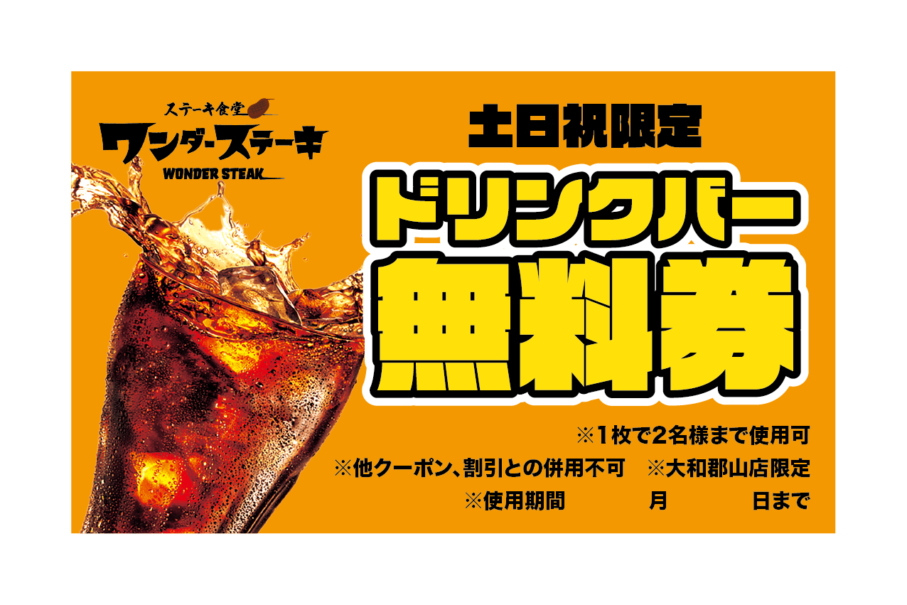 ワンダーステーキを展開する株式会社C-HUNDRED(所在地:大阪府大阪市北区、代表:細原誠は、ワンダーステーキ大和郡山店にて、「ドリンクバー無料券」の配布を実施しています。