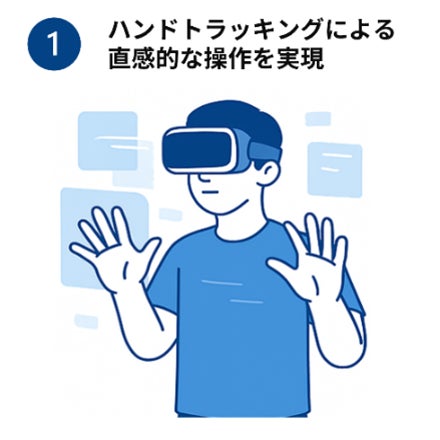 ① コントローラーを使用せずに素手で操作できる、高精度なハンドトラッキング機能を実現。現実の動作と同じように操作できるため、より高い没入感と学習効果が得られます。