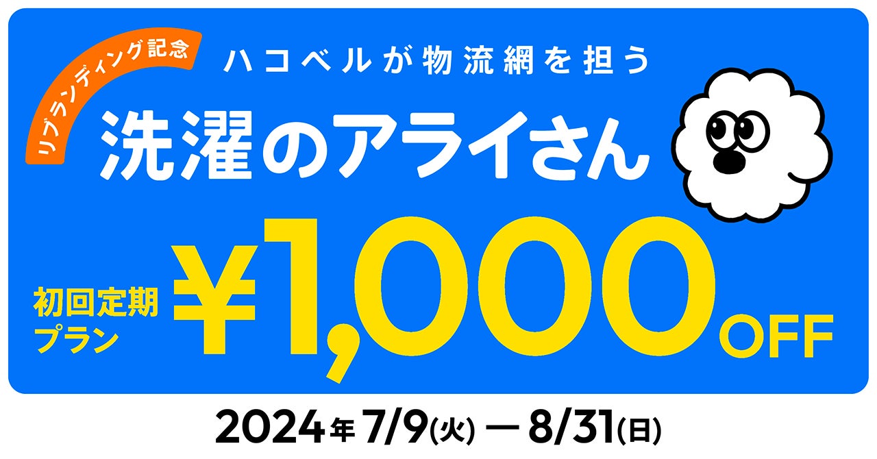 物流プラットフォーム「ハコベル」を展開するハコベル株式会社(本社:東京都中央区、代表取締役社長CEO:狭間 健志、以下:ハコベル)は、住友商事株式会社(本社:東京都千代田区、代表取締役 社長執行役員 CEO:上野 真吾、以下:住友商事)と株式会社白洋舍(本社:東京都大田区、代表取締役社長 :五十嵐 瑛一、以下:白洋舍)が共同で開始した洗濯代行サービス「洗濯のアライさん」(https://arai-san.com/)において、サービスの安定稼働を実現するべく物流網の効率化において貢献しております。同サービスが株式会社TBWA HAKUHODO(本社:東京都港区、代表取締役社長兼CEO:内田 渉、以下 TBWA HAKUHODO)を新たなパートナーに迎え、2024年7月9日(火)、名称変更のうえさらなるステージに踏み出すことを記念し、「洗濯のアライさん 定期プラン初回1,000円off」キャンペーンを実施することをお知らせいたします。
