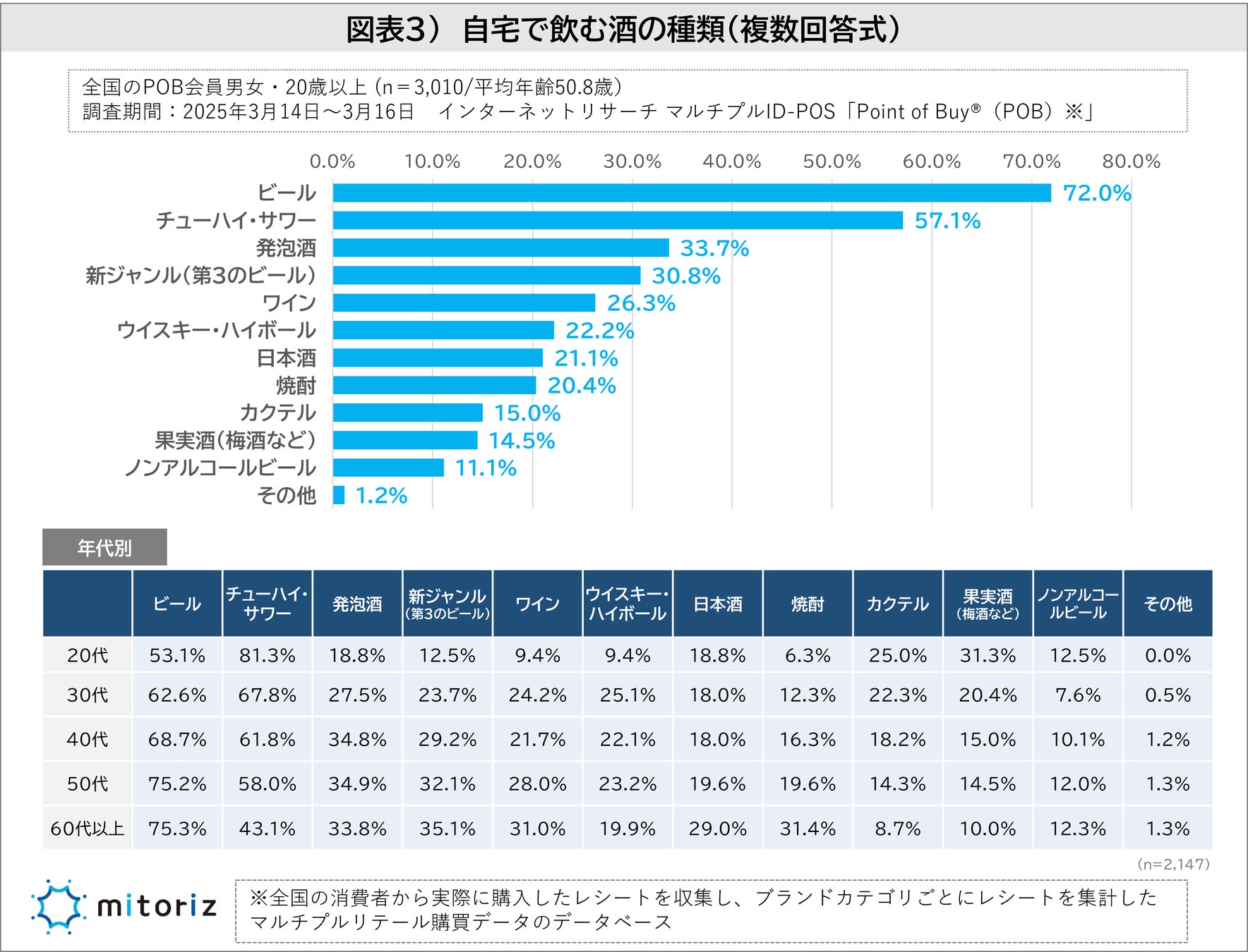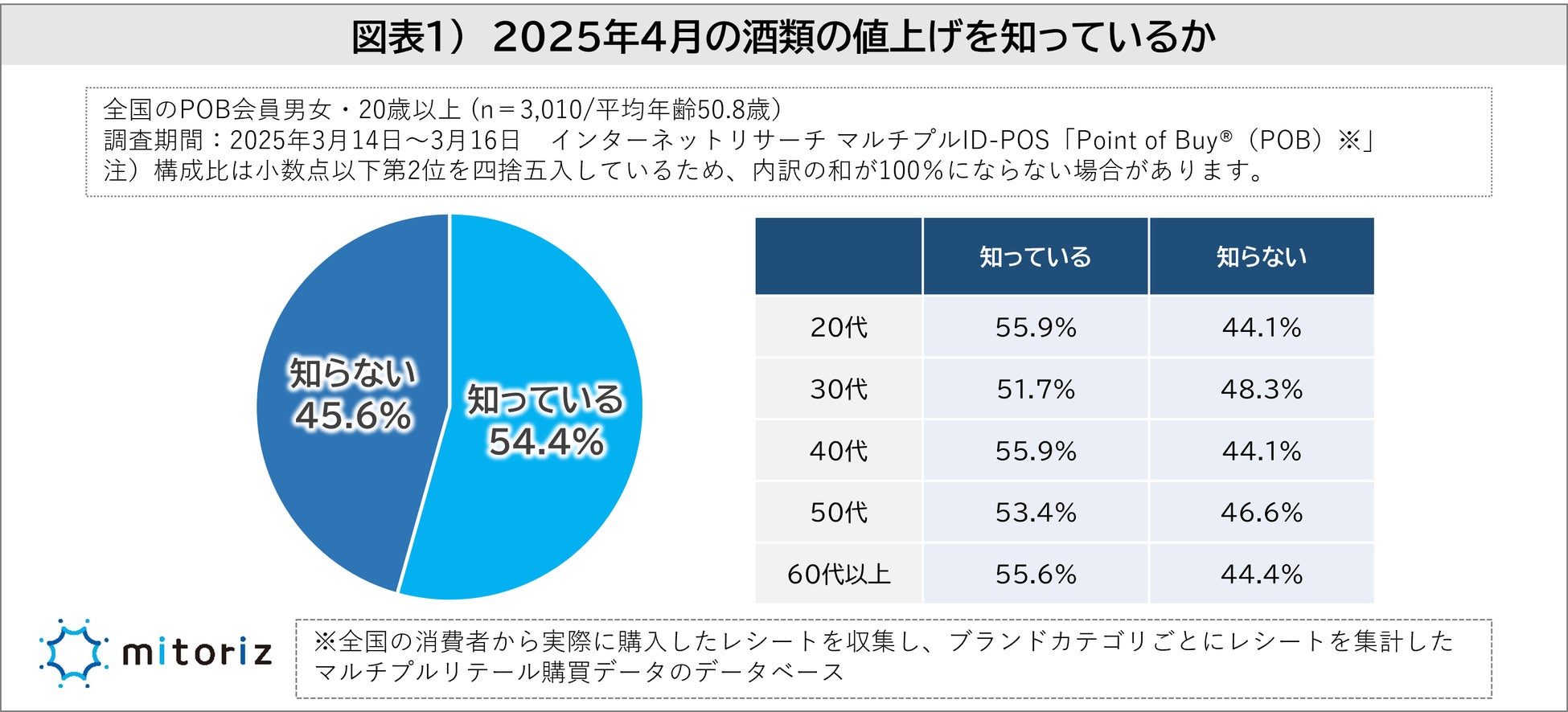 株式会社mitoriz(本社:東京都港区、代表取締役社長:木名瀬博)は、消費者購買行動データサービス「Point of Buy®(以下、POB)」の会員3,010人に「酒類の値上げに関する調査」を実施しました。