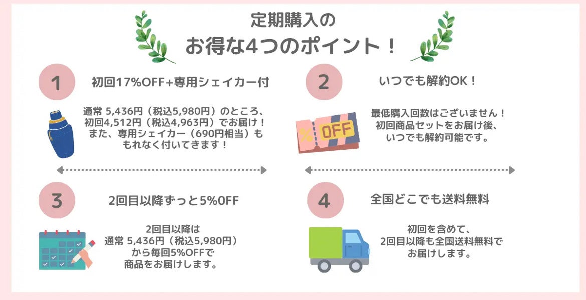 2回目以降は通常5,436円からから毎回5%オフで商品をお届けします。
