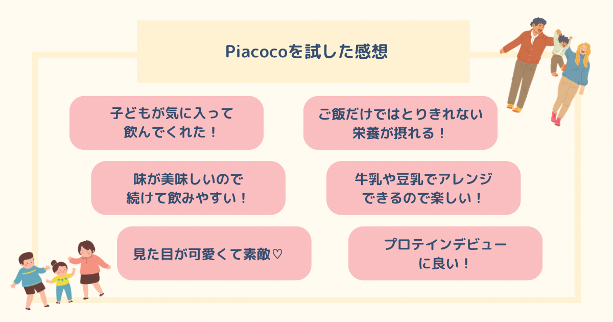 キッズプロテインを試したことがない方が多い中でもpiacocoは半数以上の方にご好評いただきました!