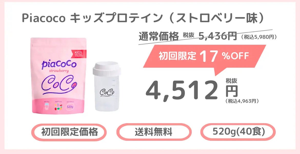 piacocoストロベリー味520g(40 食分)が通常、5,436円のところ初回限定で4,512円の17%オフでお試しができます。さらに初回限定価格、そして送料無料というお得な条件付き!