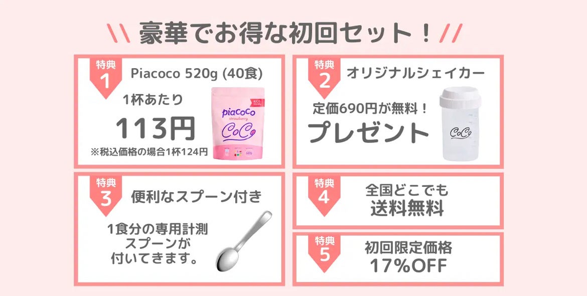 piacocoストロベリー味520g(40 食分)が通常、5,436円のところ初回限定で4,512円の17%オフでお試しができちゃう!