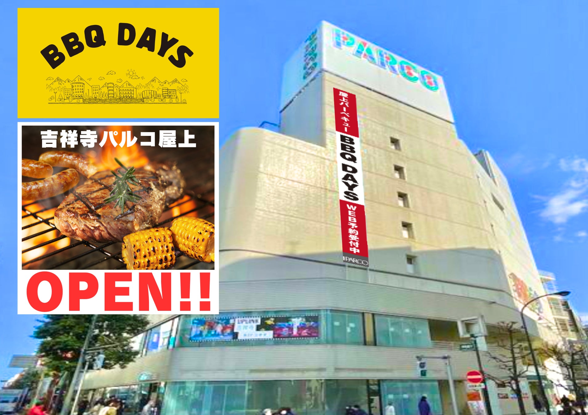 【吉祥寺パルコ】屋上 バーベキュー会場「BBQDAYS」 が今年もオープン!! 期間限定(4/19~10/14)★★★《 全員ソフトドリンク飲み放題付き‼ 》 手ブラもOK!!