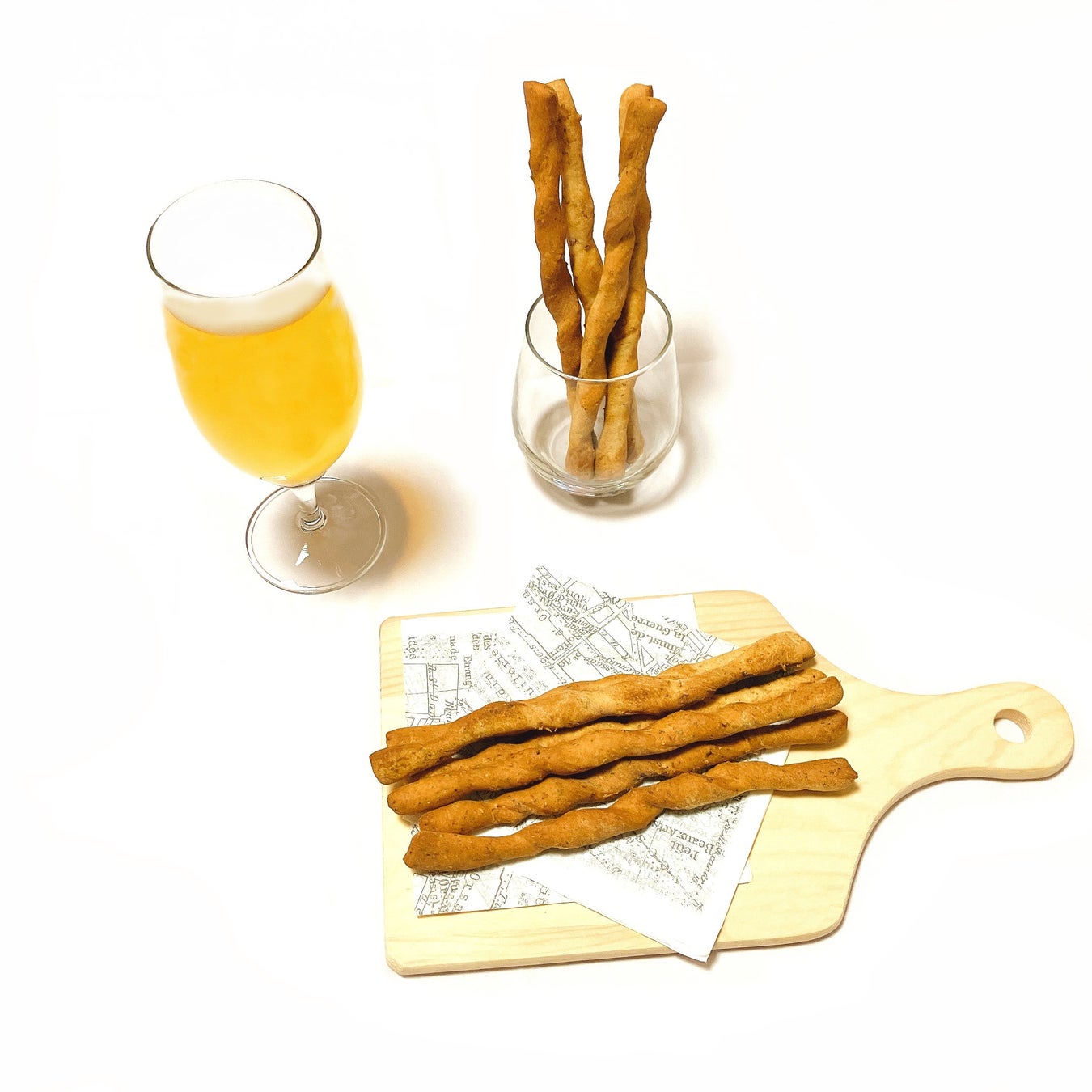 パンの種類は柔らかいものがいいのか硬いものがいいのか、味は甘いものがいいのか塩辛いものがいいのか…考え抜いた上、イタリアで人気の「グリッシーニ」を選定しました。甘みと苦みと香りのバランスに試行錯誤を重ねて、ようやく完成したのが「クラフトビールで仕込んだグリッシーニ」です。