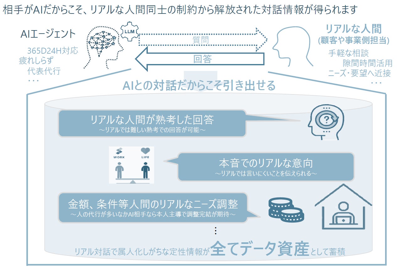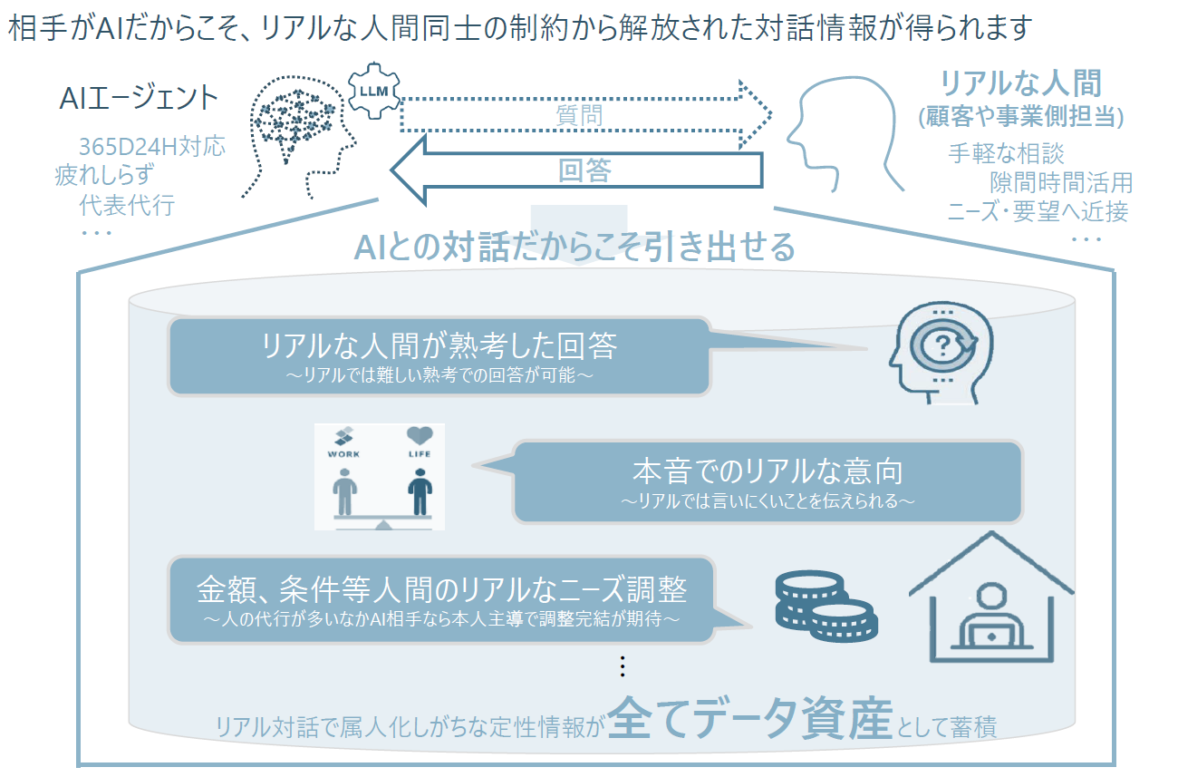 本システムでは、365日24時間利用可能なため、本人が実際に足を運んだり、打ち合わせの時間を設けたりせずに、より定性的なやりとりを踏まえた相性を調べることが可能になり、HR領域の複雑なニーズに応えることを目指します。また、AIエージェントが個人の情報を深掘りするため、限られた時間の中での会話では引き出せなかった情報や、考慮されなかった定性的な情報も取り込むことが可能になります。そのため、人間(従来の採用エージェント)が行うのは難しい、精度の高いマッチングを実現でき、ユーザーは安心してマッチング確率の高い企業の採用に応募ができるようになります。また、実際のご利用時は、これらのコミュニケーション対象はデジタルクローンが行うため、報酬面や条件面等の繊細なやりとりができる期待など、人間が行う対話以上の情報交換を実行できる可能性を持っています。