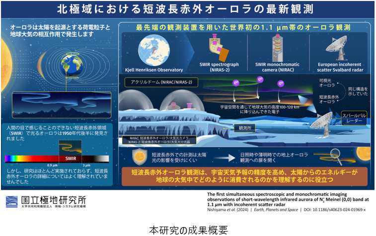 国立極地研究所の西山尚典助教、小川泰信教授を中心とする、東北大学、電気通信大学、産業技術総合研究所などの研究グループは、北極スバールバル諸島のロングイヤービンにおける観測から、世界で初めて波長1.1 µmで発光するオーロラを撮像することに成功しました。本成果は、空の明るい夏の時期や昼間など、地上からの観測の難しい「日照下オーロラ」の撮像につながる技術であり、多様なオーロラの生成メカニズムの解明への貢献が期待されます。