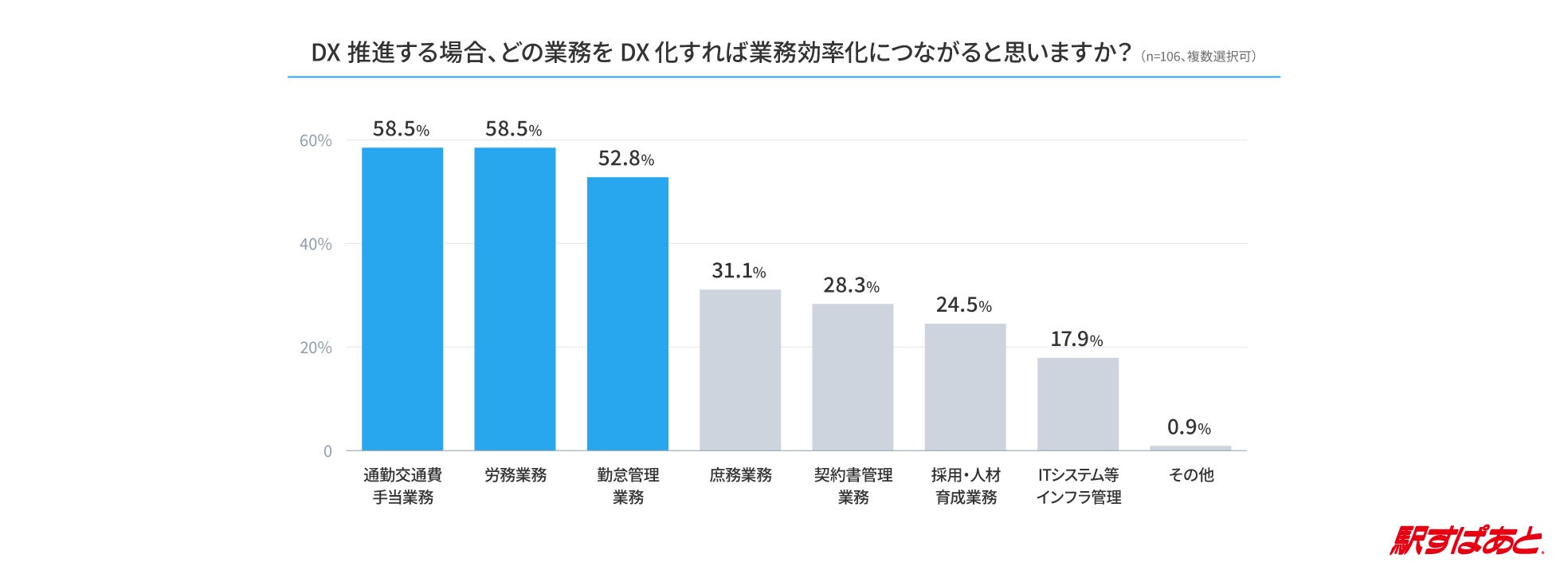 DX化に取り組んでおらず、且つDX化ができていない理由で「DX化したくない・必要性を感じていない」と回答した以外の人に「DX推進する場合、どの業務をDX化すれば業務効率化につながると思いますか?(複数選択可)」と質問したところ、「通勤交通費手当業務」58.5%「労務業務(勤怠管理・給与計算・社会保険雇用保険の手続き・福利厚生等)」58.5%が最も多く、次いで「勤怠管理業務」52.8%となりました。DX化に「取り組んでいる・完了した」と回答した層の「現在DX推進できていると感じる業務」と、上位3項目が同じという結果になりました。「DX化ができていない理由」で「何から着手すればよいかわからない」という層は、まずこの3項目の業務からDX化を進める第一歩とするのが良いのかもしれません。