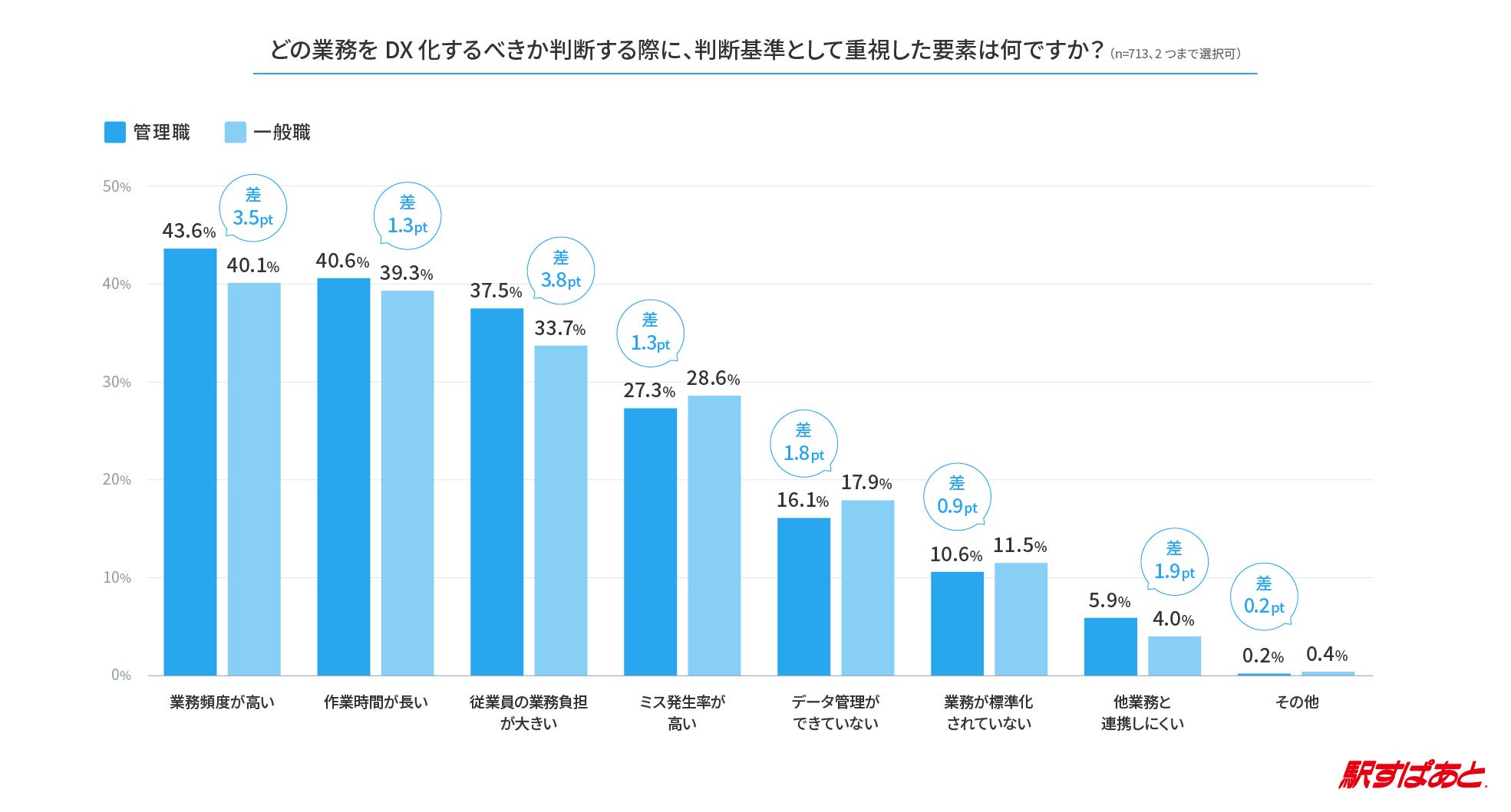 DX化に「取り組んでいる・完了した」したと回答した層に、「どの業務をDX化するべきか判断する際に、判断基準として重視した要素は何ですか?(2つまで選択可)」と聞いたところ、「業務頻度が高い」が最も多く、次いで「作業時間が長い」、「従業員の業務負担が大きい」と続きました。この設問では、管理職と一般職の乖離が最も大きいもので3.8pt差に留まり、判断基準がほぼ一致するという結果になりました。