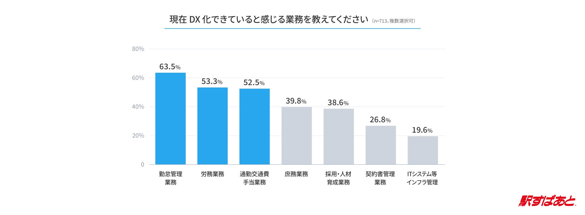 DX化に「取り組んでいる・完了した」したと回答した層に、「現在DX化できていると感じる業務を教えてください(複数回答)」と聞いたところ、「勤怠管理業務」63.5%が最も多く、次いで「労務業務(勤怠管理・給与計算・社会保険雇用保険の手続き・福利厚生等)」53.3%、「通勤交通費手当業務」52.5%となりました。DX化に取り組んでいる層でも、DX化できている業務にはバラツキがあるようです。