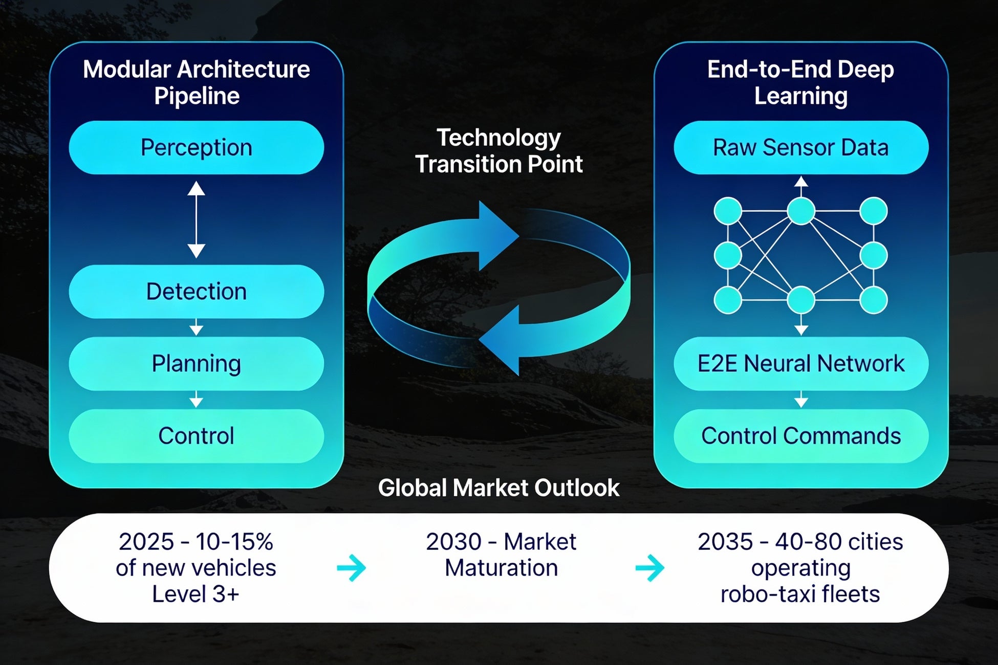 特に、エンドツーエンド深層学習への技術転換、ロボタクシー商用化の加速(2035年までに40~80都市)、電動化との統合、ならびに次世代チップ・AI処理能力の向上が、市場拡大の主要なドライバーです。