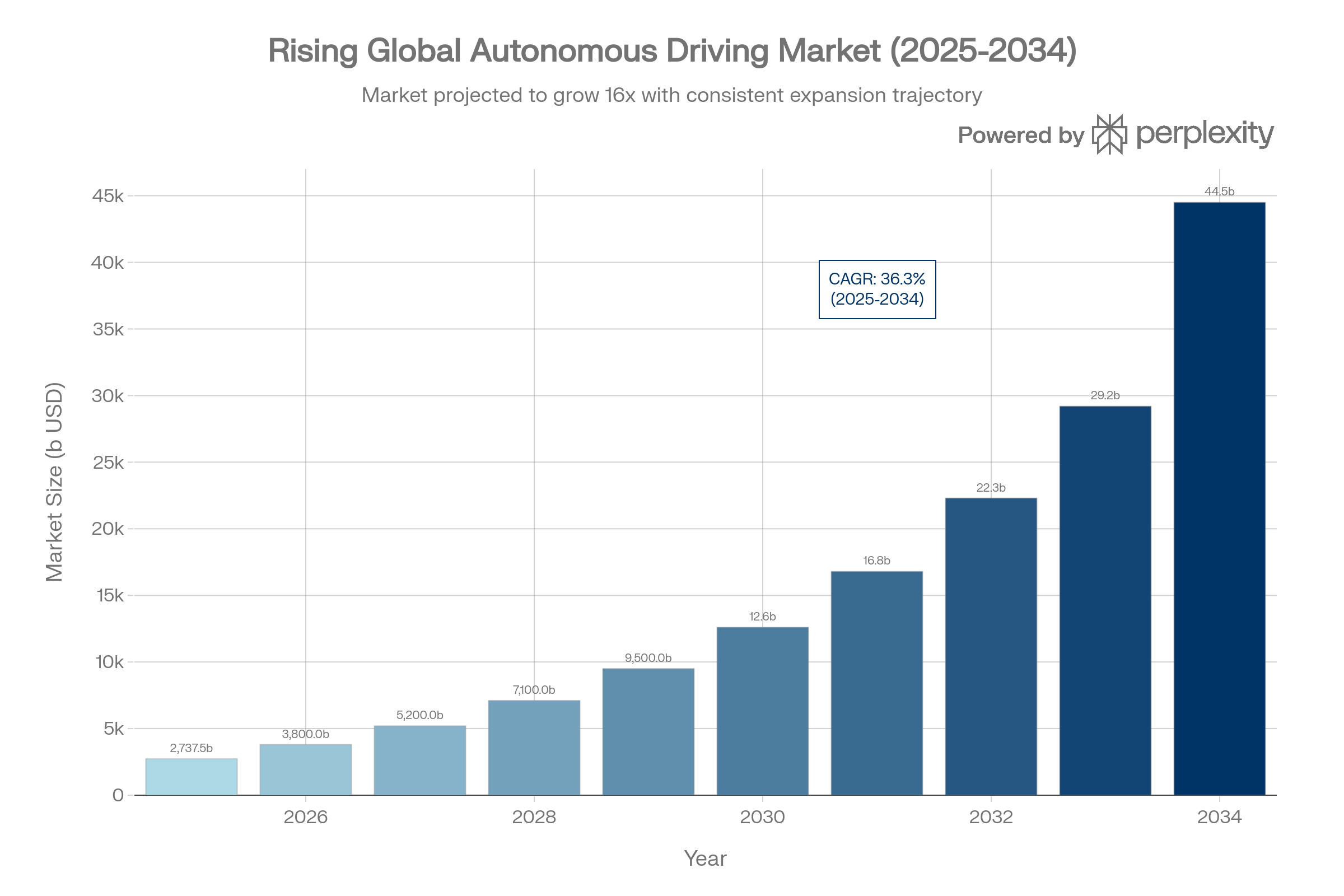 2025年から2035年にかけて、世界の自動運転市場は年平均成長率36.3%で急速に拡大し、市場規模は2.7兆ドルから44.5兆ドルへと16倍以上に成長することが確実です。