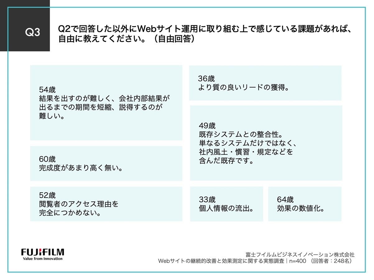 Q2で「わからない/答えられない」以外を回答した方に、「Q3.Q2で回答した以外にWebサイト運用に取り組む上で感じている課題があれば、自由に教えてください。(自由回答)」(n=400)と質問したところ、「より質の良いリードの獲得」や「効果の数値化」など248の回答を得ることができました。