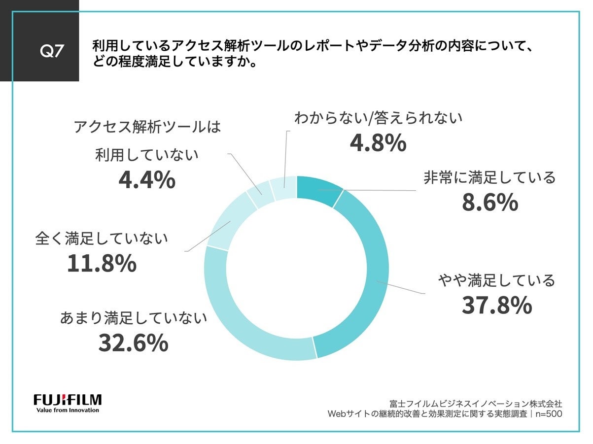 「Q7.利用しているアクセス解析ツールのレポートやデータ分析の内容について、どの程度満足していますか。」(n=500)と質問したところ、「非常に満足している」が8.6%、「やや満足している」が37.8%という回答となりました。