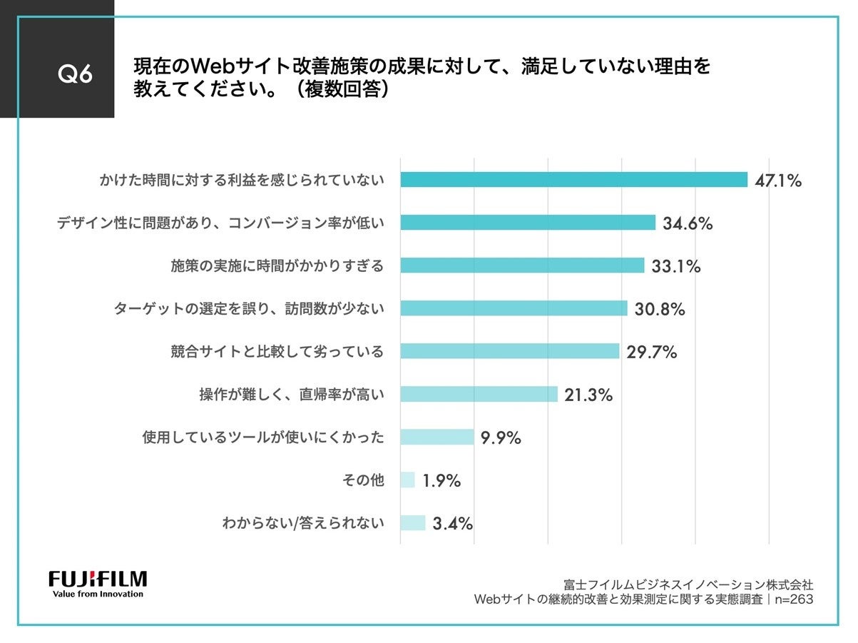 Q4で「あまり満足していない」「全く満足していない」と回答した方に、「Q6.現在のWebサイト改善施策の成果に対して、満足していない理由を教えてください。(複数回答)」(n=263)と質問したところ、「かけた時間に対する利益を感じられていない」が47.1%、「デザイン性に問題があり、コンバージョン率が低い」が34.6%、「施策の実施に時間がかかりすぎる」が33.1%という回答となりました。