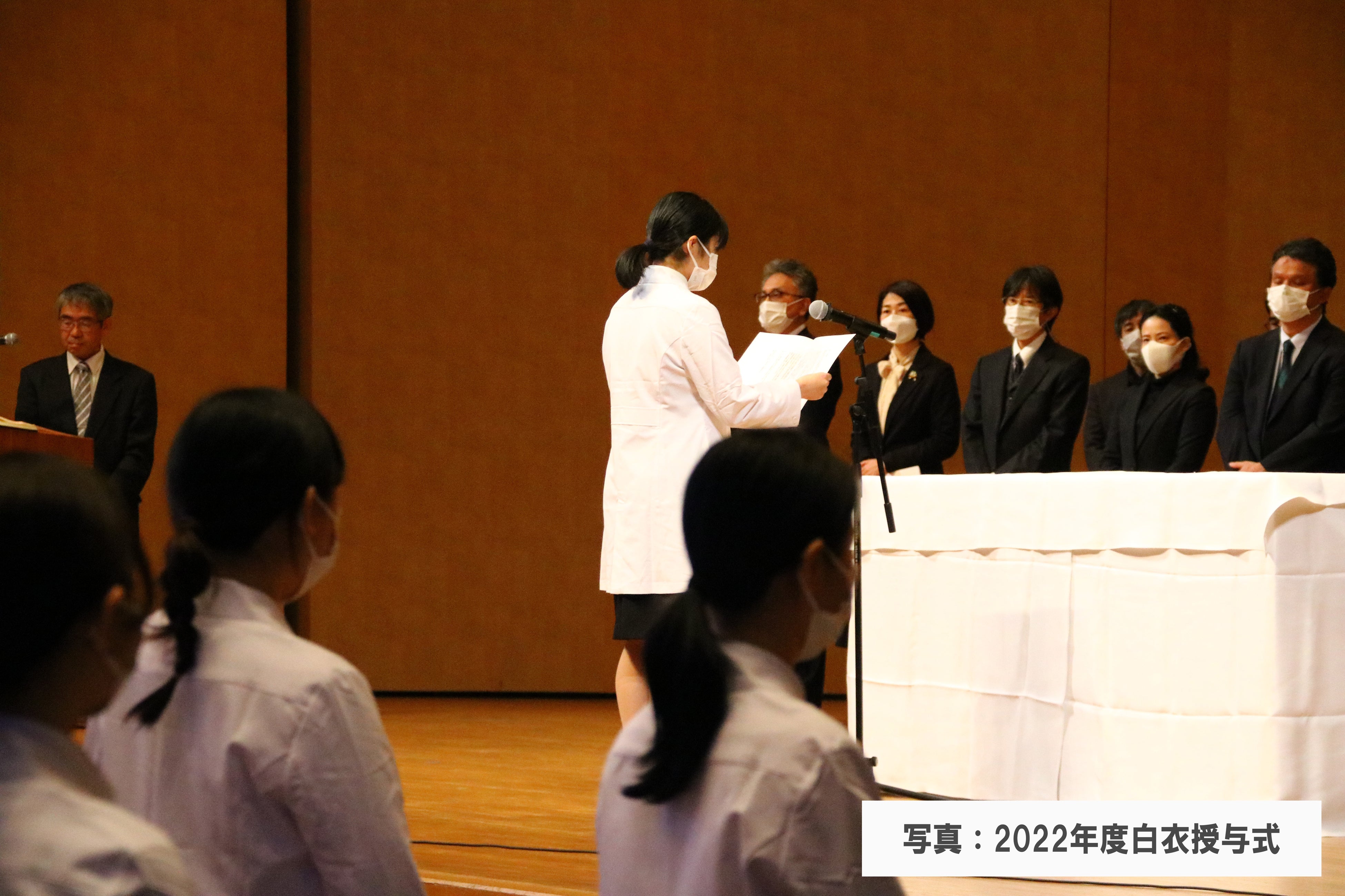 本学学生としての自覚と責任を持って実習に臨んでほしい、という願いを込めて、授与する白衣には学生の名前を刺繍しました。式典は礼拝形式で行われ、ひとりひとりに白衣を手渡しします。本式典を通して、知識や技能のみならず、命と健康を守る使命感、責任感、倫理観を身につけ、プロフェッショナルの卵としての自覚を新たにできるよう、取り組んでいます。