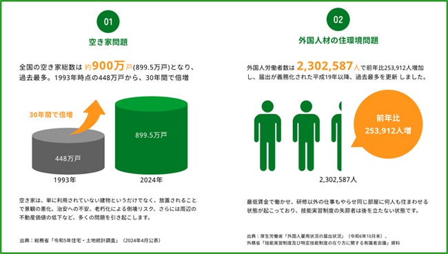 総務省の調査によれば、国内の空き家数は約900万戸と過去最多を記録しており(※1)、喫緊の社会課題として顕在化しています。一方で、国内の外国人労働者数も約230万人に達し、過去最高を更新し続けています(※2)。こうした就労拡大に伴い、外国人材を受け入れるための住環境整備へのニーズは急速に高まっています。